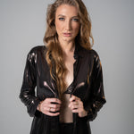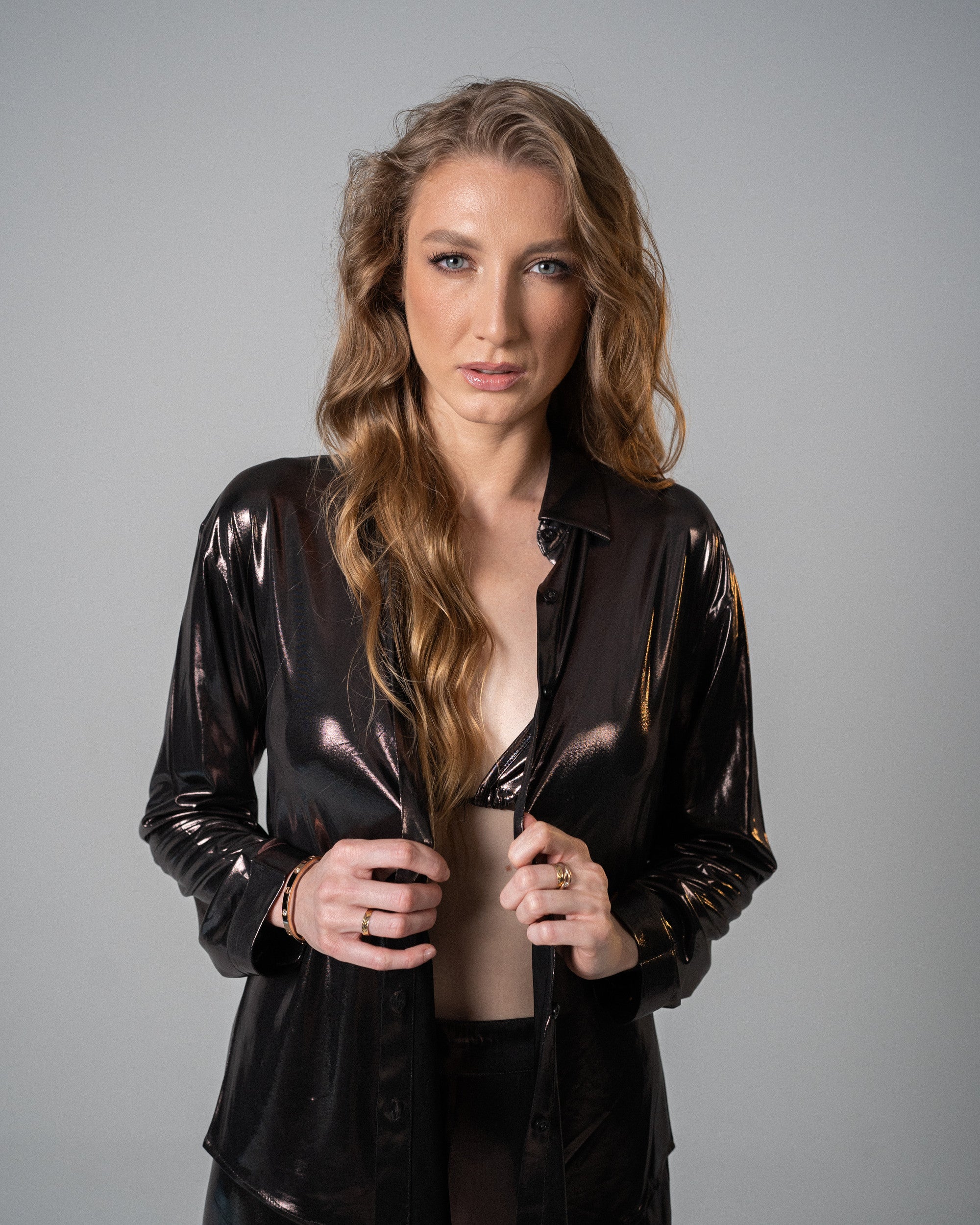 The bikini top is designed to make a bold statement, with adjustable straps for a tailored fit and a modern silhouette that complements the metallic sheen of the fabric. The **shirt features a relaxed, button-up style that can be worn open for a laid-back look or fully closed for a more polished, chic ,vibe. The pants are crafted with a high-waisted, wide-leg design that elongates the legs, while the metallic lycra fabric adds a futuristic, body hugging effect that’s flattering and comfortable.The luxurious metallic finish ensures you catch the light and the spotlight with the soft lycra fabric feels like a second skin.
