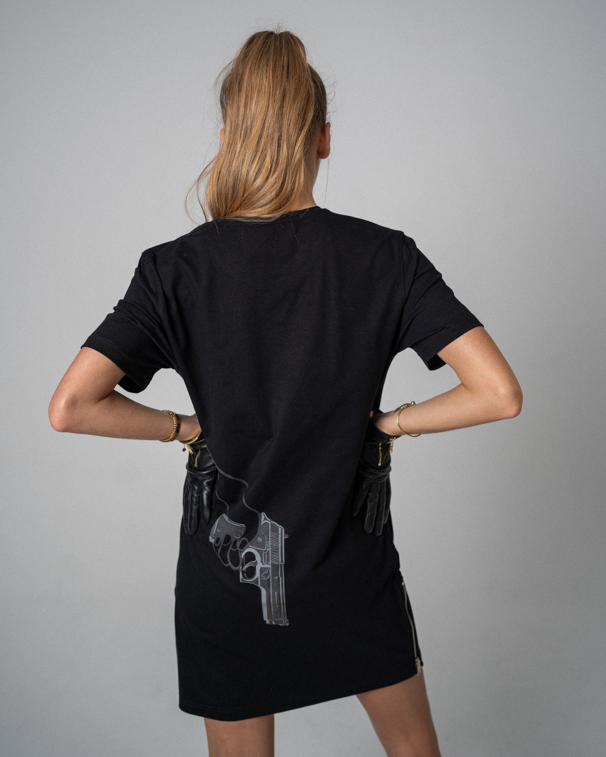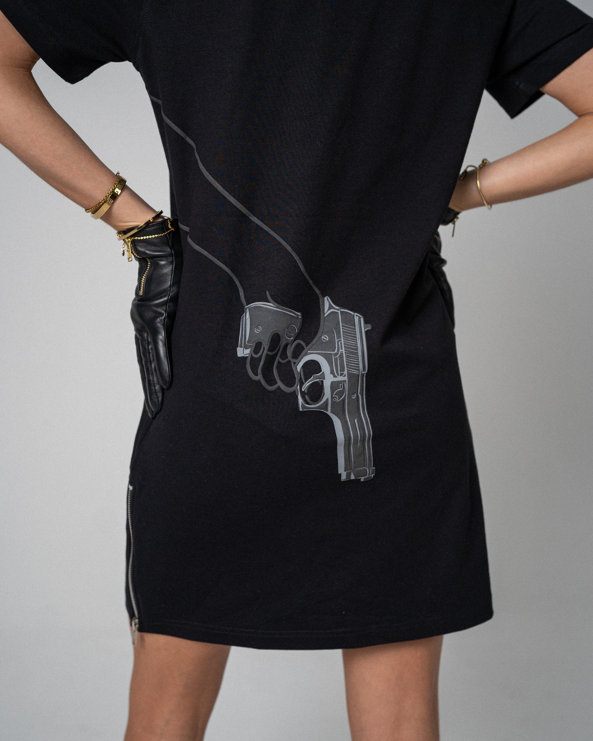 Adding an extra touch of edge and practicality, this t-shirt dress features small side zips, allowing for easy movement and a customizable fit. Whether you wear it with sneakers for a casual day out or dress it up with boots for a more elevated look, this dress is perfect for those who like to make an impact with their fashion.