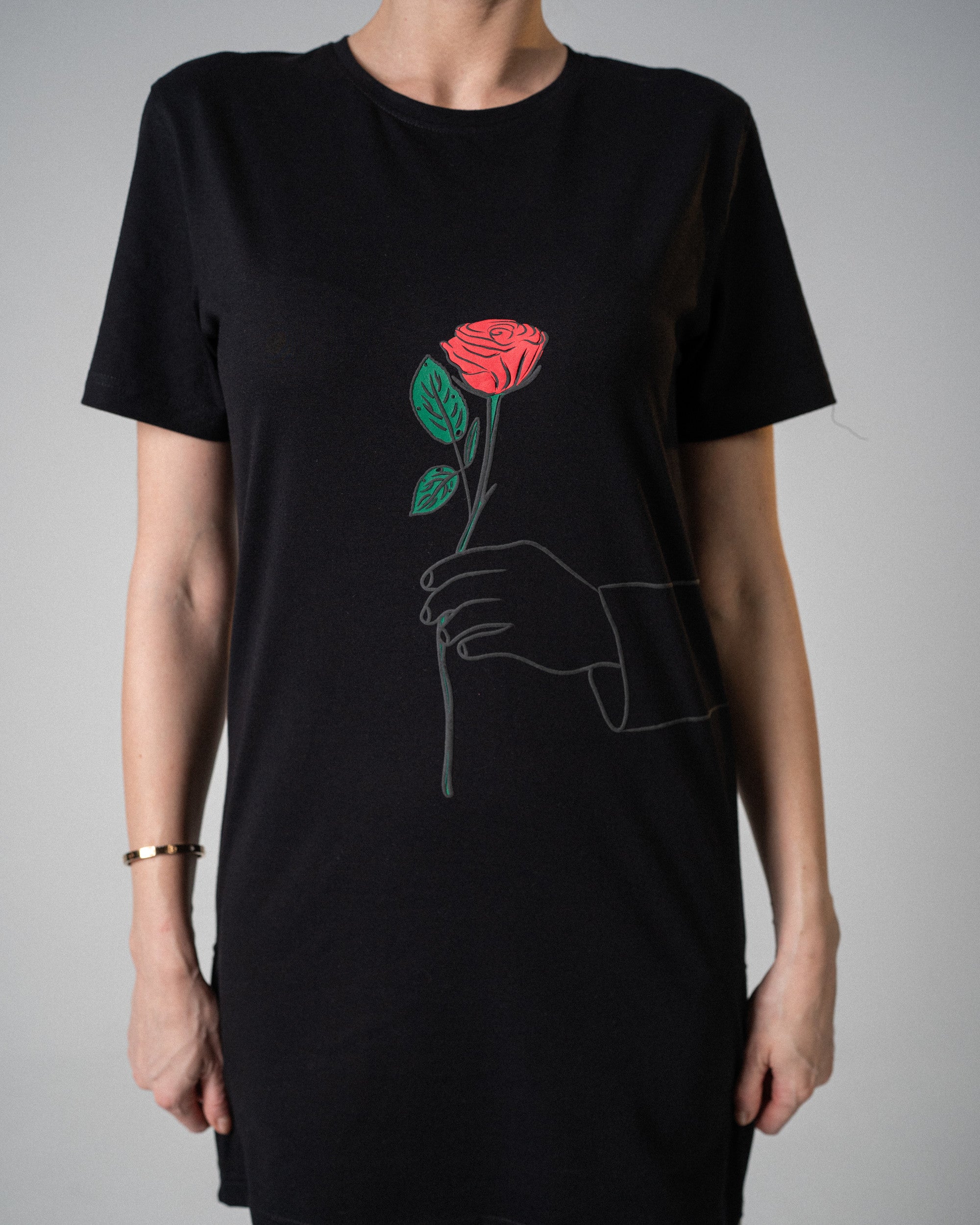 - Rose and gun puff print designs on the front and back with textured layers for added dimension