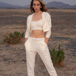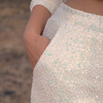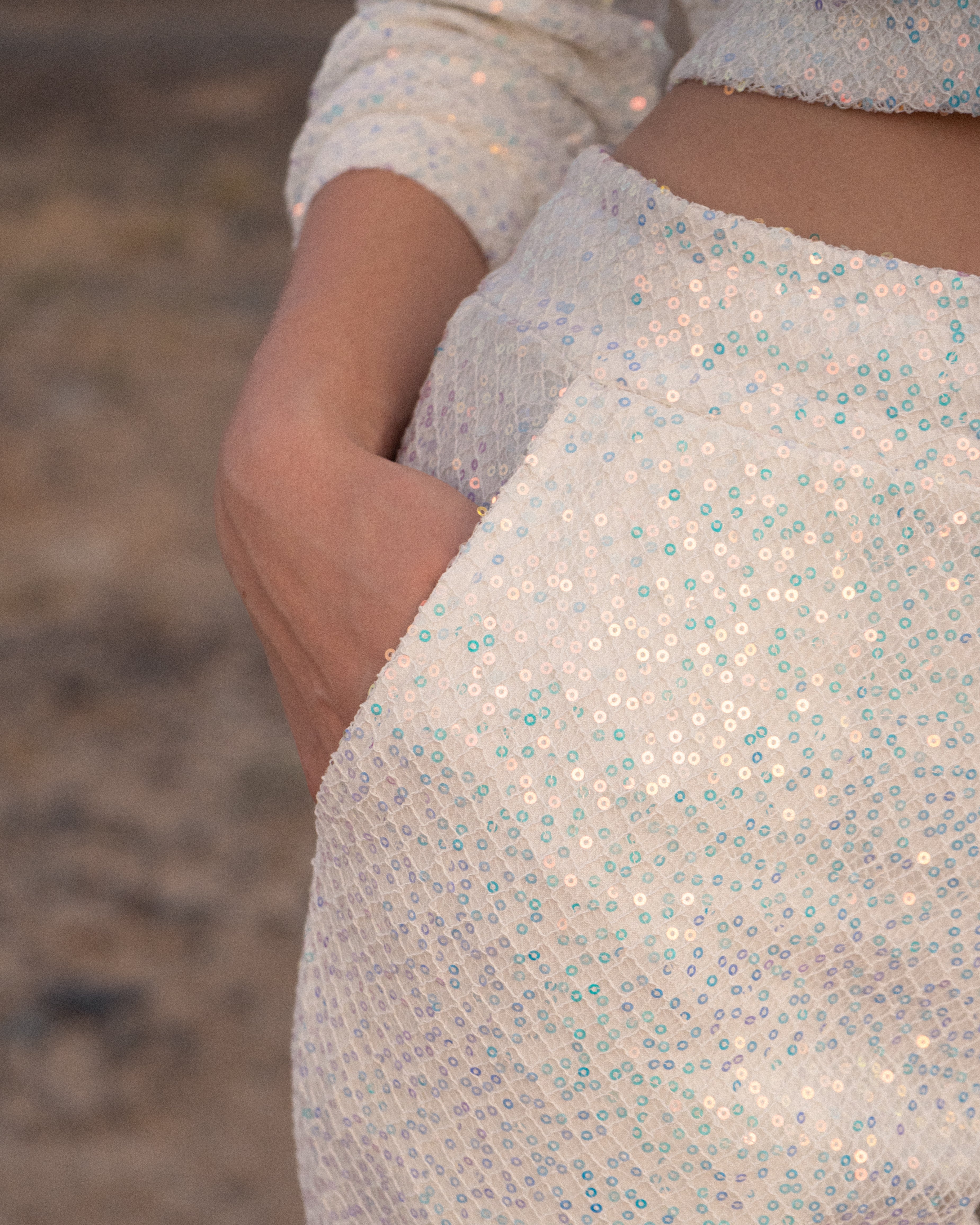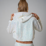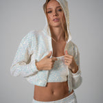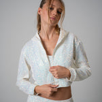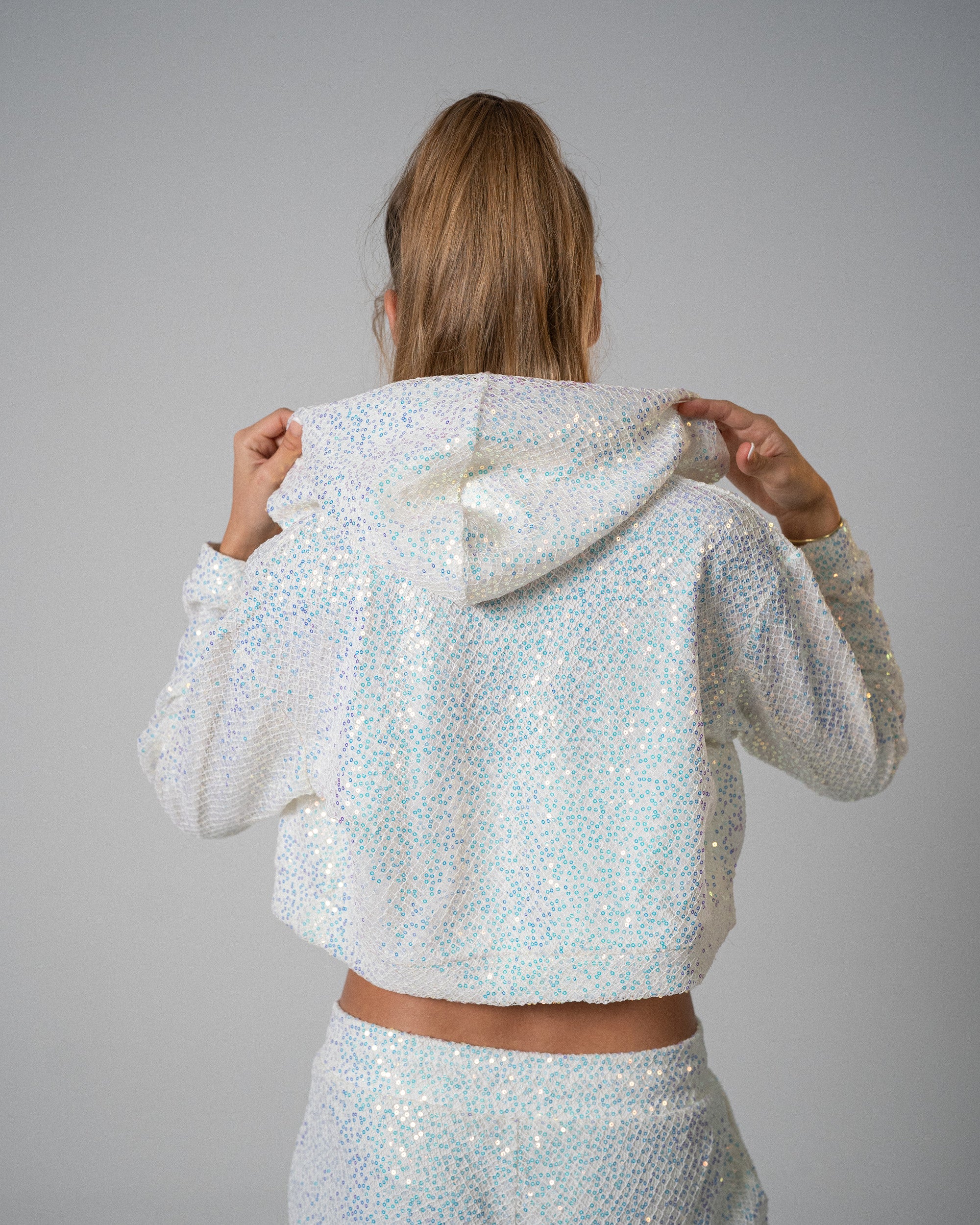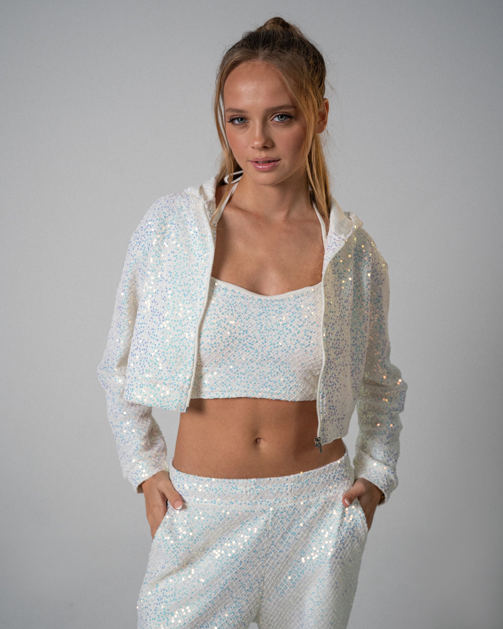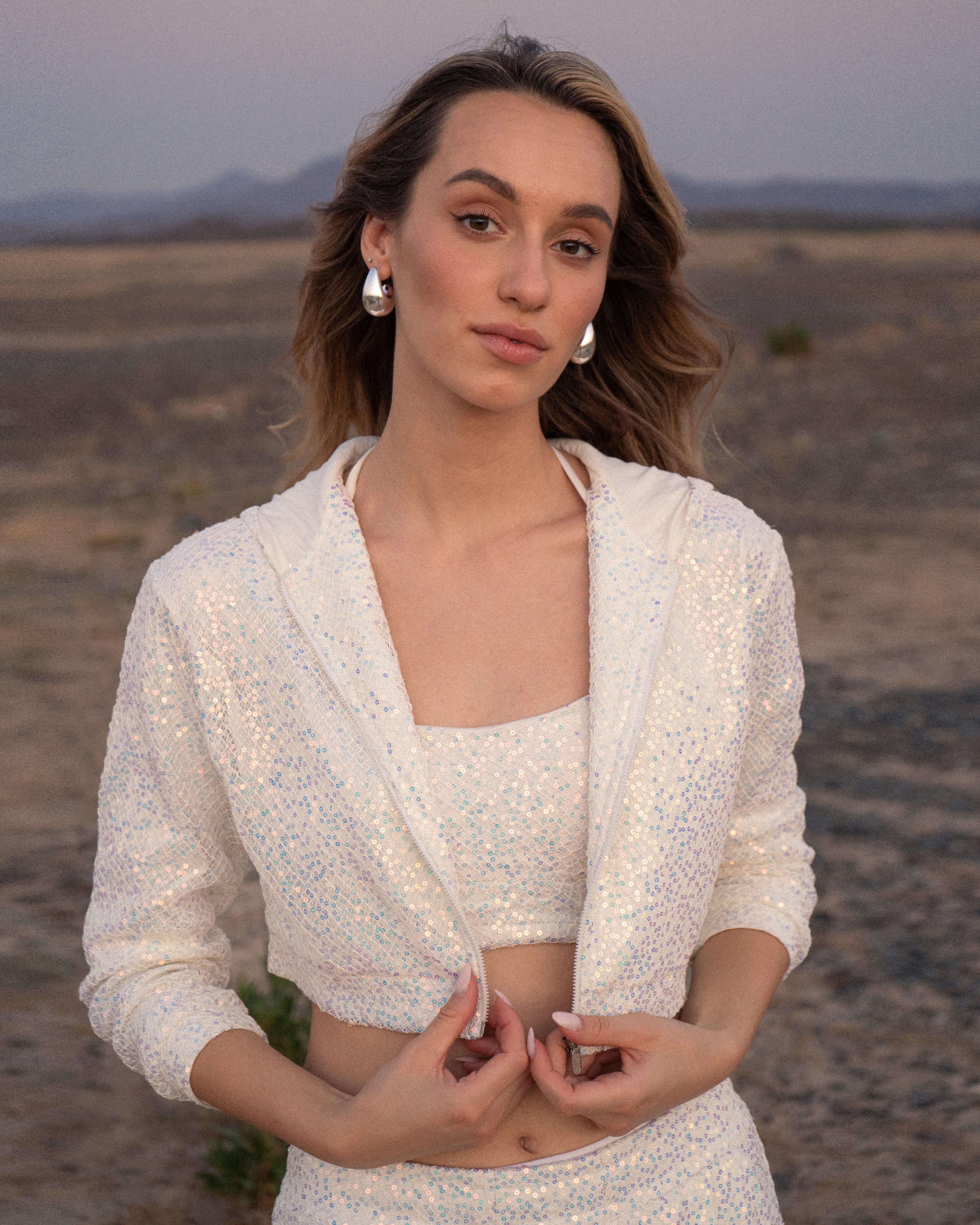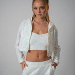Step into effortless glam with our White Sequin Net Tracksuit – the perfect blend of sporty chic and high-fashion sparkle. This two-piece set features a cropped bomber jacket with a hoodie and matching joggers, both crafted from lightweight, breathable net fabric. The base color is a crisp white, but the sequins catch the light to reveal beautiful shades of blue, giving you a radiant, multidimensional look that shimmers with every move. The bomber jacket features a zip-up front for an easy fit, with a cozy hoodie to keep you warm and stylish. The joggers boast a relaxed, comfortable silhouette with side pockets for both function and flair. Designed with a cotton-lycra modal lining, this tracksuit ensures softness against the skin, providing the perfect balance of comfort and luxury.