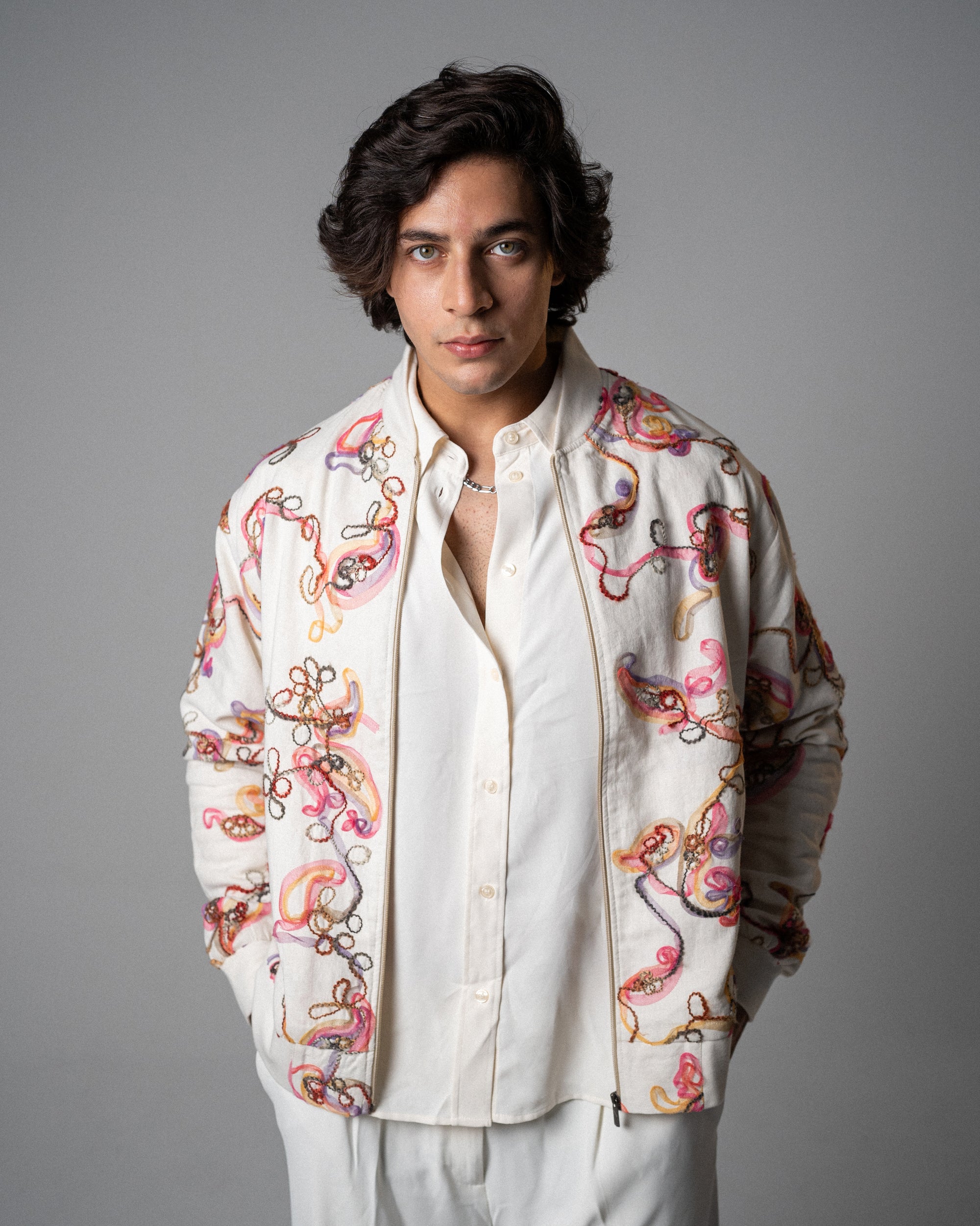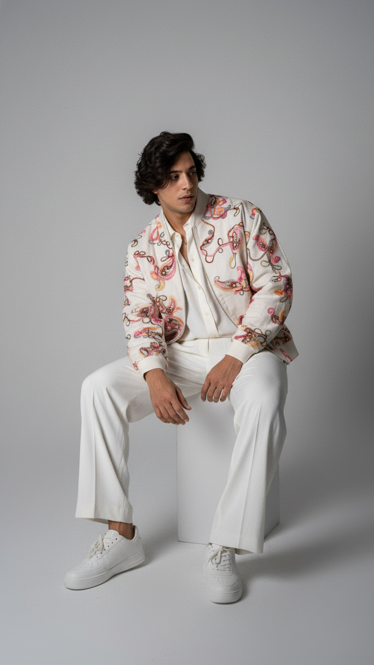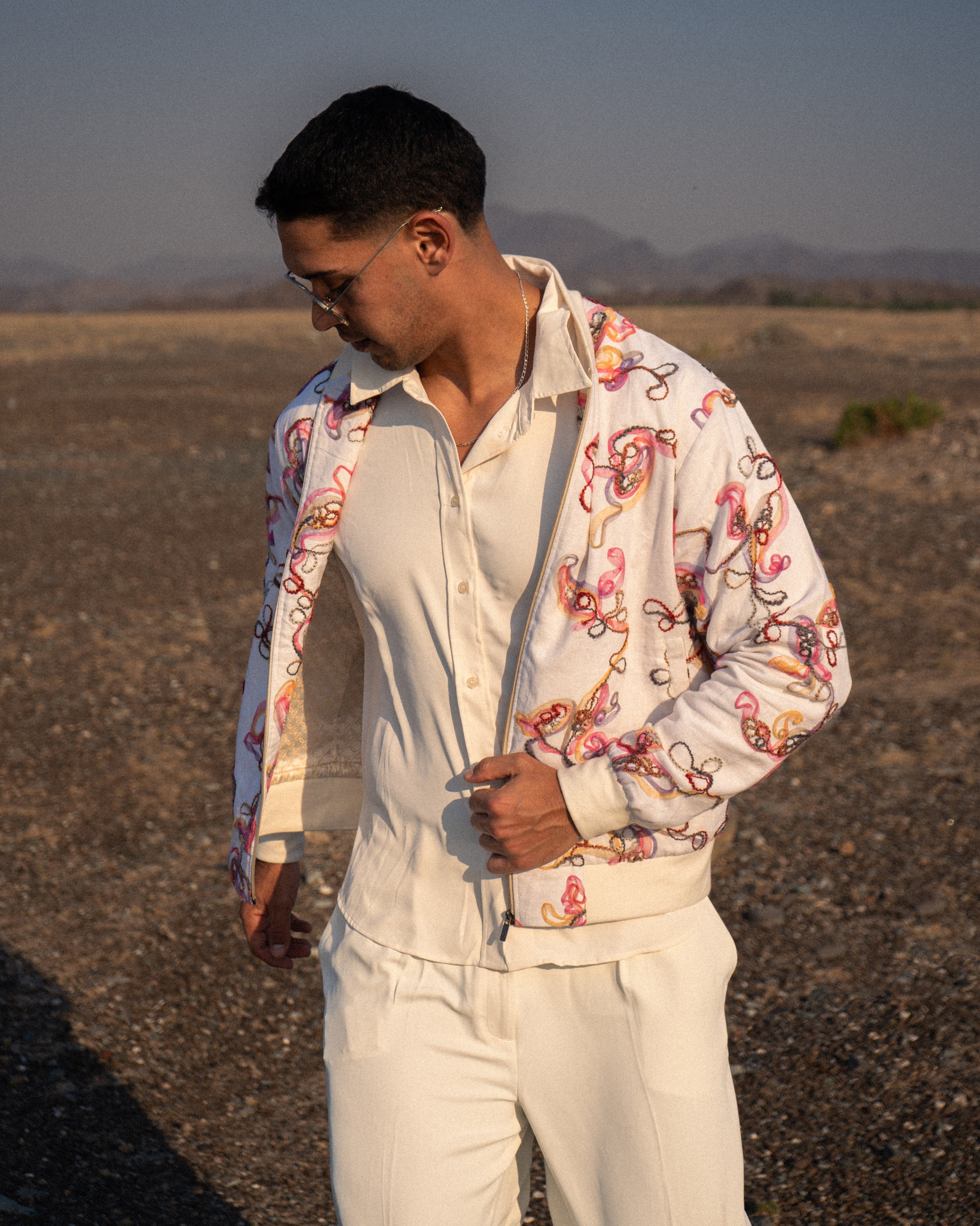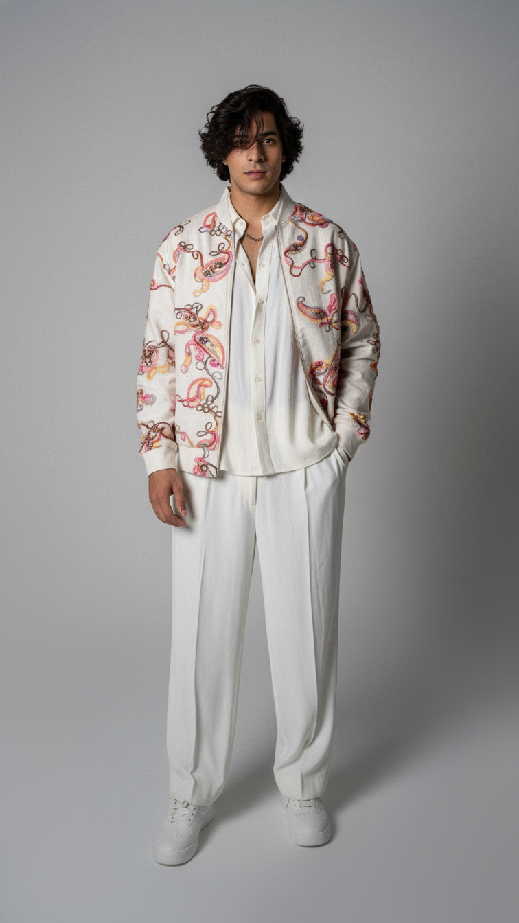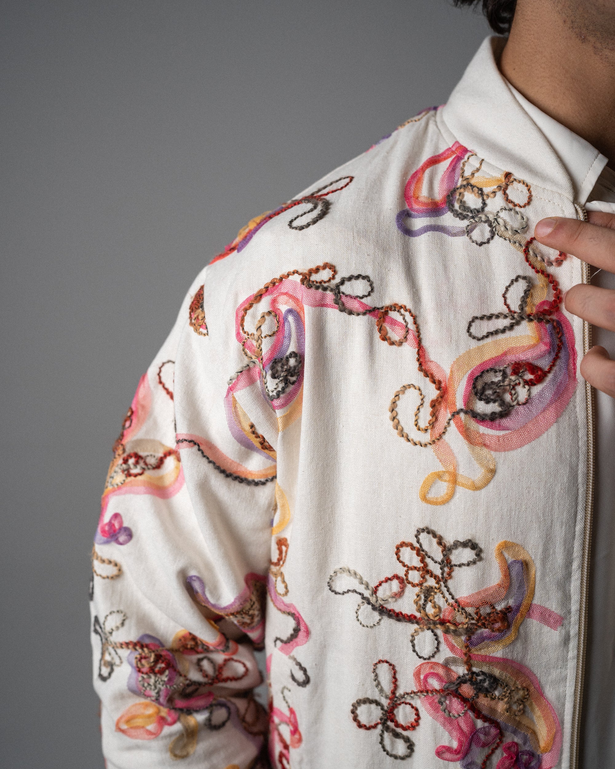 embroidery adds dynamic, textured accents that bring this jacket to life.