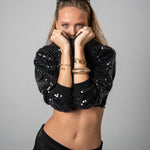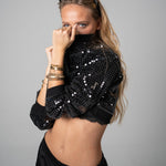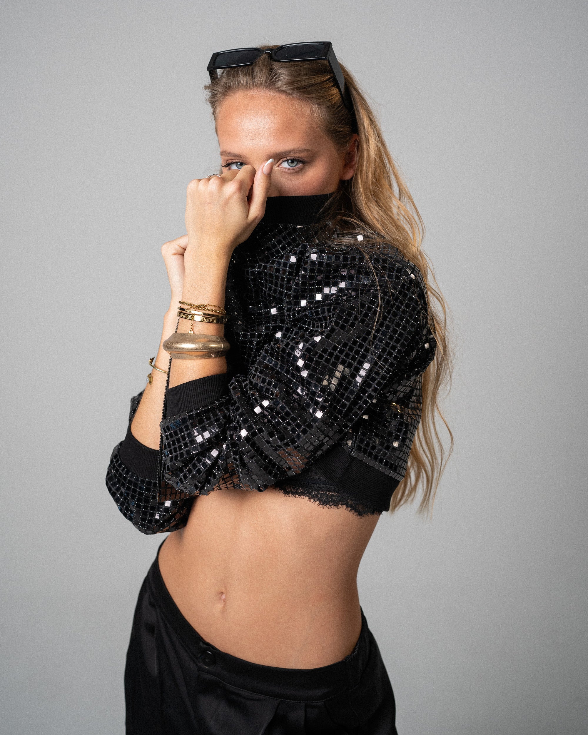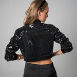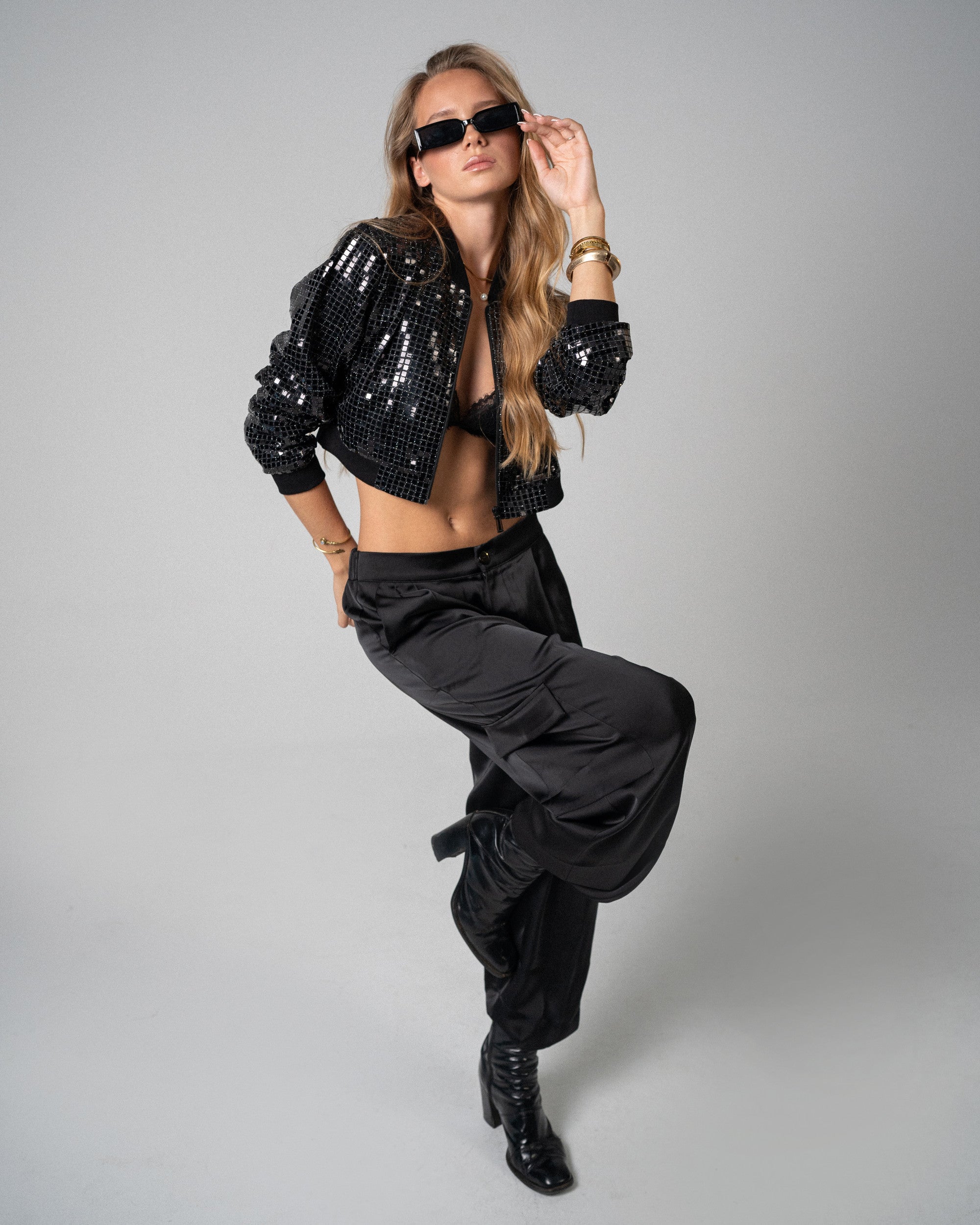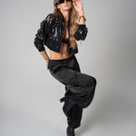 Turn heads and sparkle with confidence in our glam crop bomber jacket. This jacket is designed for those who love to stand out, featuring a **blingy, high-shine exterior** that catches the light with every movement. Whether you’re heading to a concert, a party, or just out with friends, this jacket is the perfect way to elevate any look with a touch of sparkle and sophistication. The cropped silhouette adds a trendy, modern twist to the classic bomber style, perfect for showing off your favorite high-waisted jeans or skirts. Inside, our **signature logo-pattern satin lining** provides a sophisticated touch, adding a layer of subtle luxury to the jacket.
