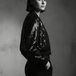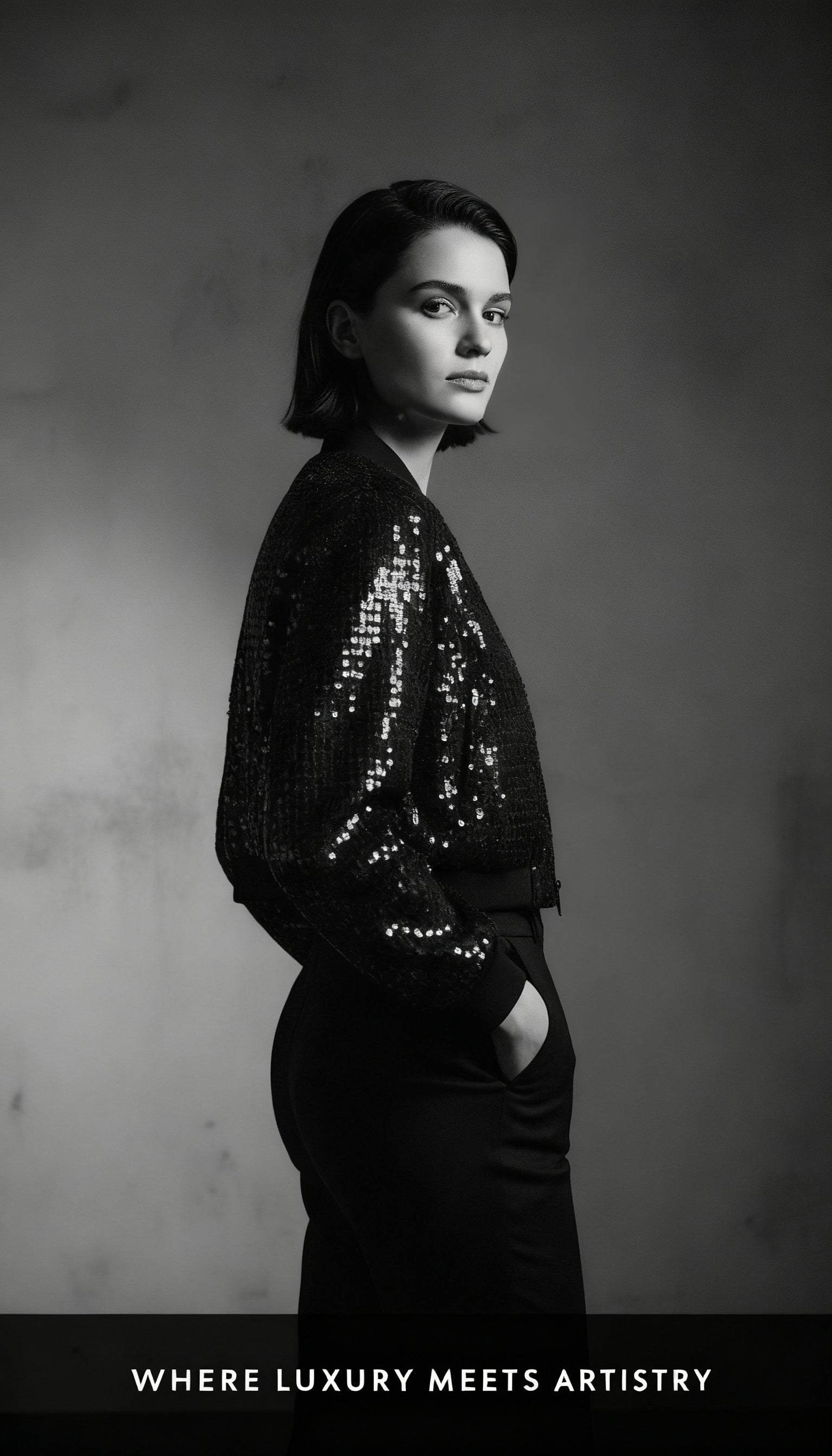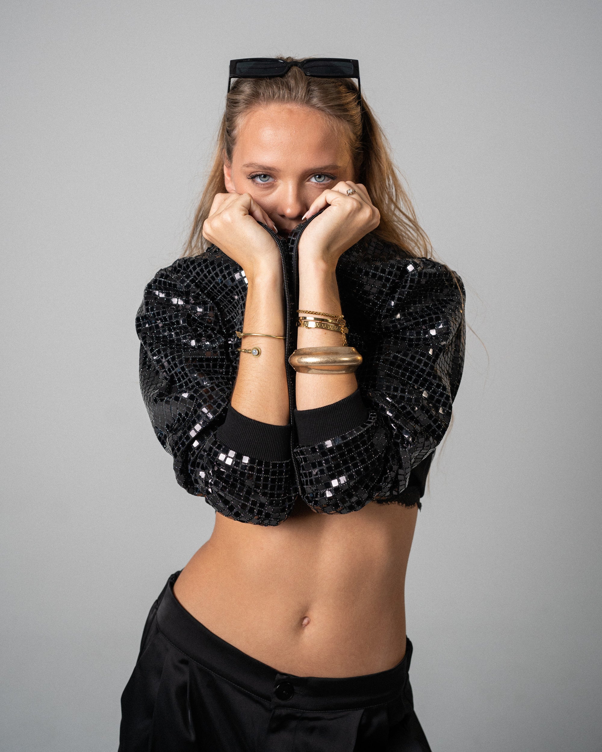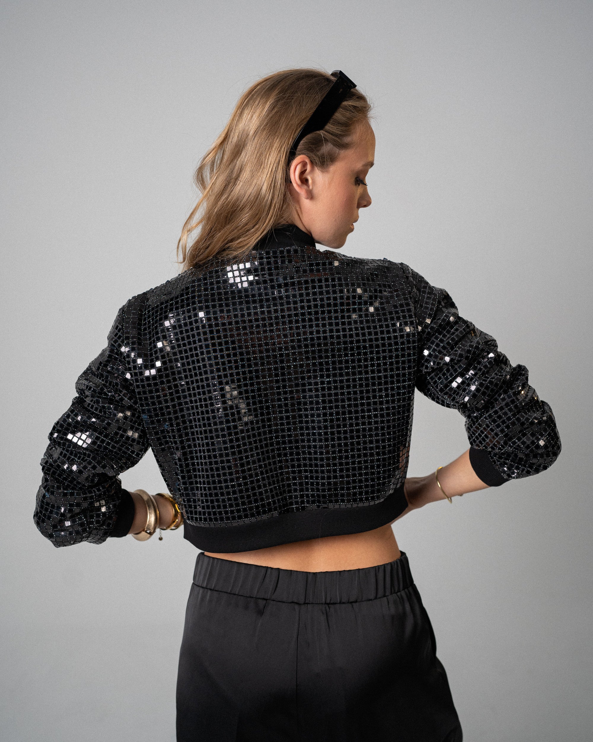 - **High-shine, blingy exterior** for a standout, sparkling finish. Cropped bomber silhouette** for a chic, modern look that’s perfect for layering