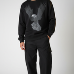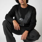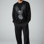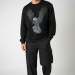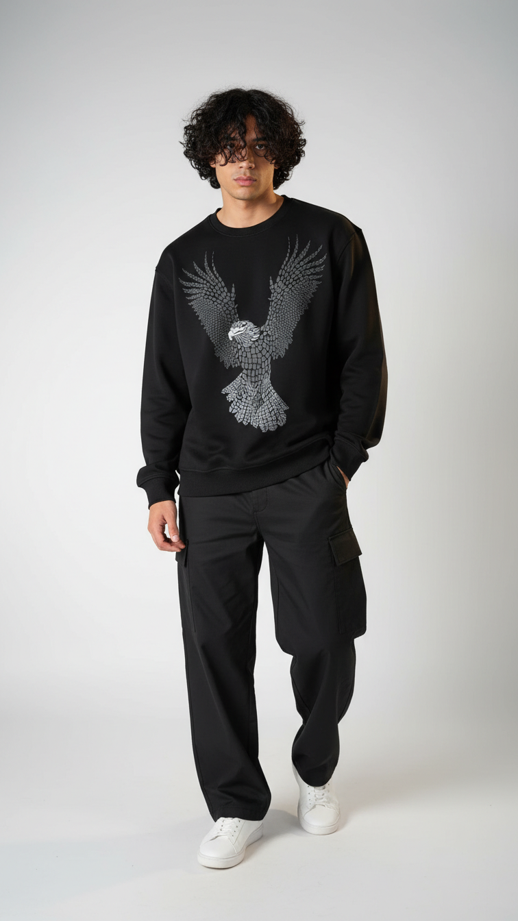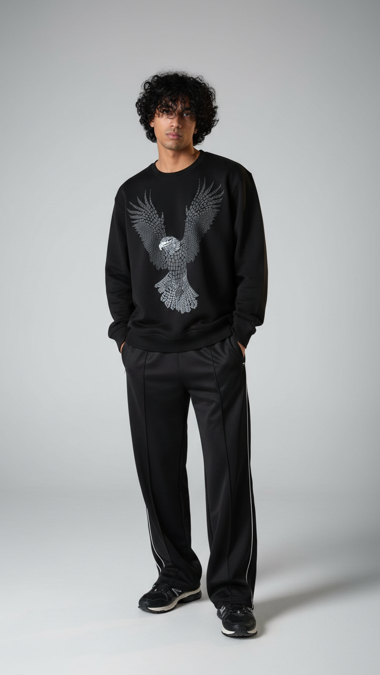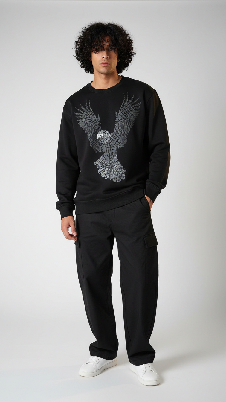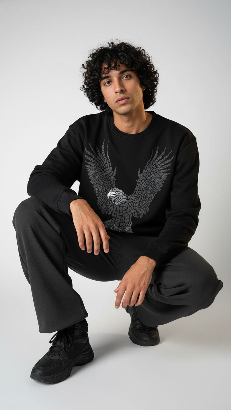 "Crafted from superior-quality mercerized fleece (360-380 gsm), this sweatshirt offers an incredibly soft, cozy feel while providing warmth and durability. The high colorfastness ensures the deep black fleece and the sophisticated print maintain their vibrancy and richness after many washes, so you can enjoy its bold look for years to come. The mercerized finish adds a smooth, refined texture, elevating the quality and feel of the fabric.