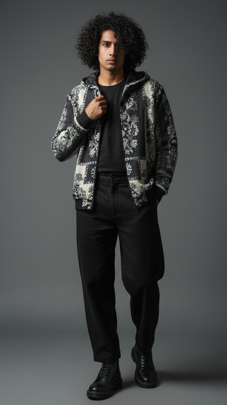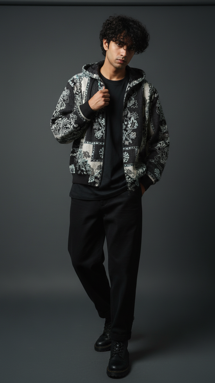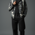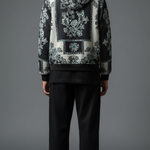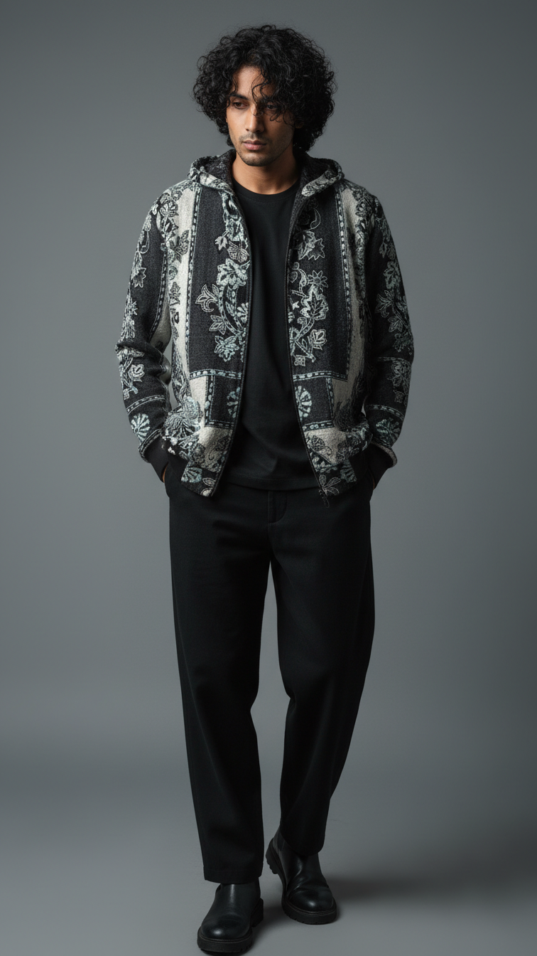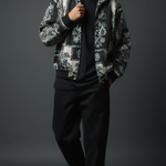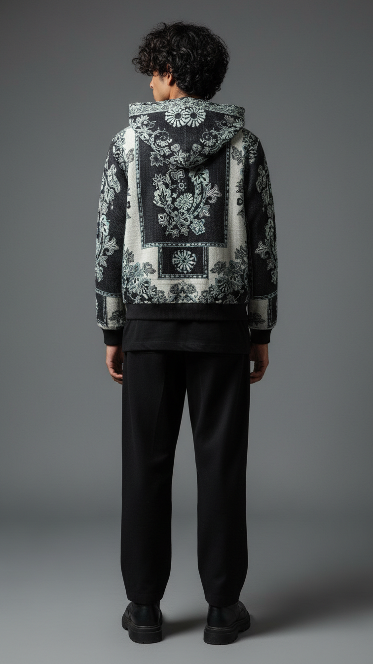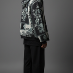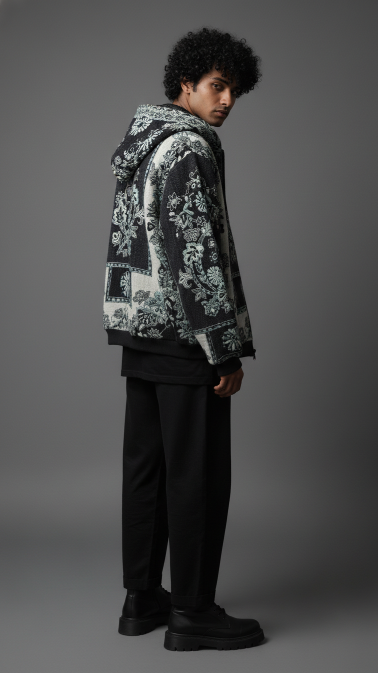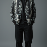Premium wool shawl collar jacket in black-and-white floral jacquard, featuring oversized embroidered panels, ribbed hem, and relaxed fit for transitional layering. Soft, insulating wool traps warmth while the shawl collar frames the face for sophisticated drape over hoodies or tees. Pairs with cargos and white sneakers for city nights or Instagram flexes, echoing Zushii's Kani heritage with modern urban luxe.