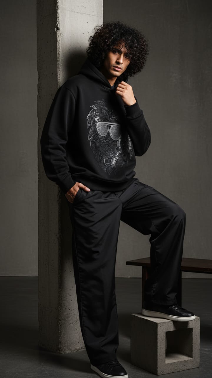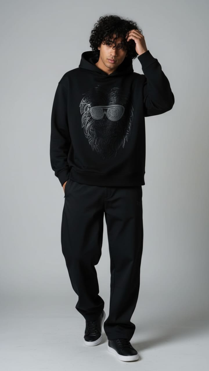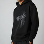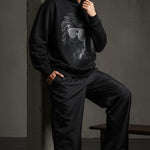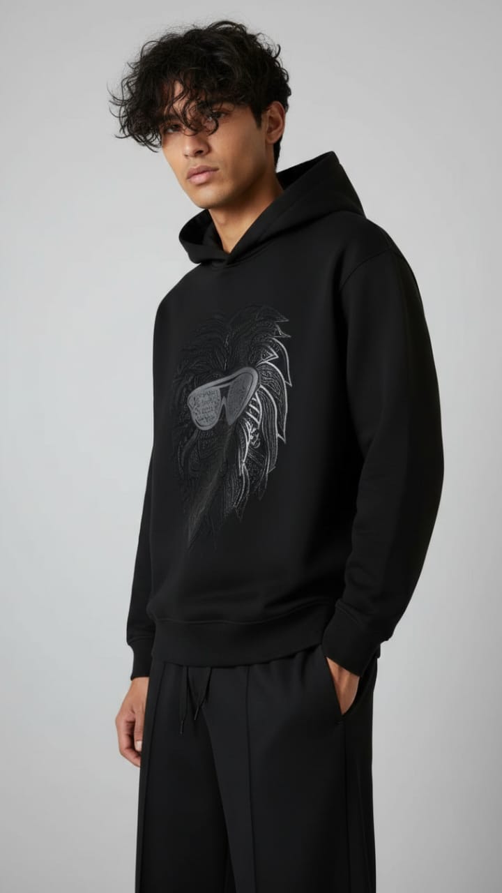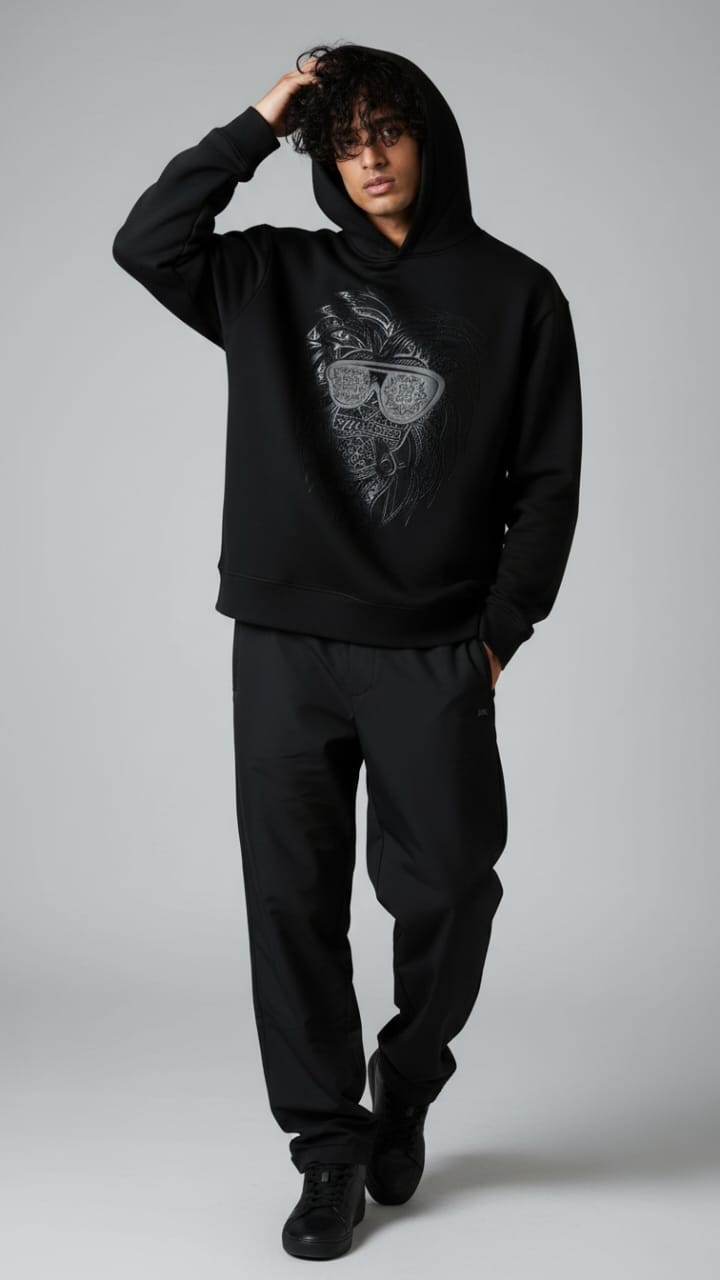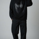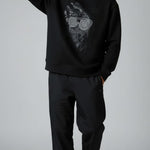 "Crafted from superior-quality mercerized fleece (360-380 gsm), this sweatshirt offers an incredibly soft, cozy feel while providing warmth and durability. The high colorfastness ensures the deep black fleece and the sophisticated print maintain their vibrancy and richness after many washes, so you can enjoy its bold look for years to come. The mercerized finish adds a smooth, refined texture, elevating the quality and feel of the fabric.