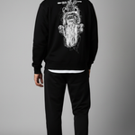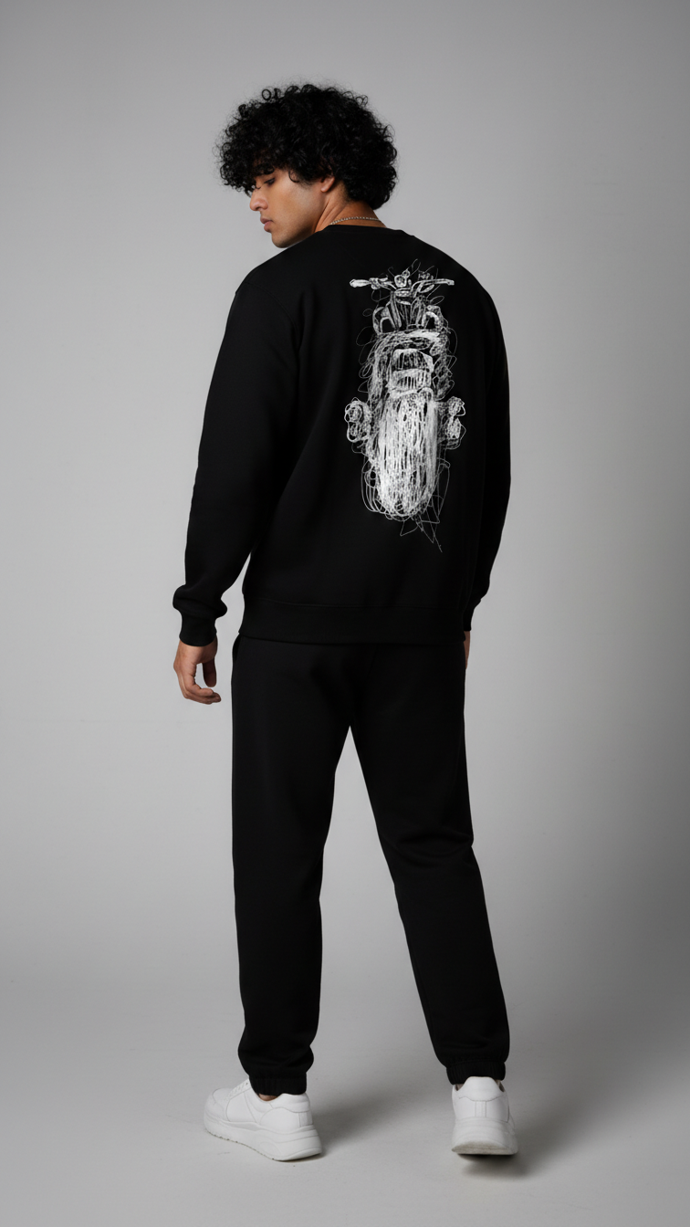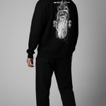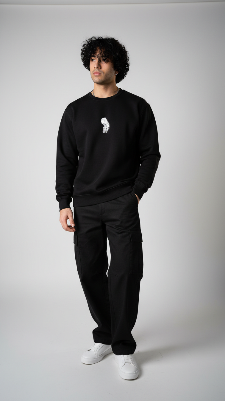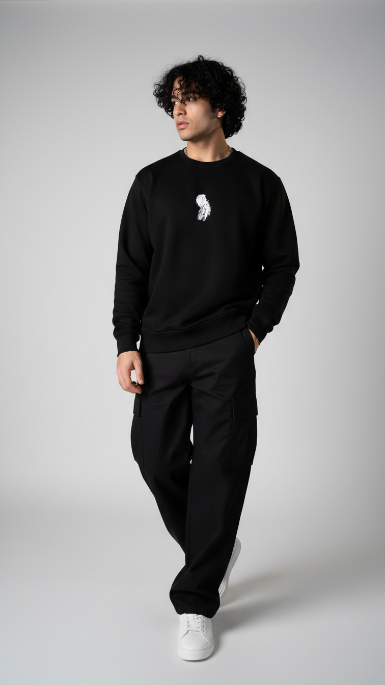 "Crafted from superior-quality mercerized fleece (360-380 gsm), this sweatshirt offers an incredibly soft, cozy feel while providing warmth and durability. The high colorfastness ensures the deep black fleece and the sophisticated print maintain their vibrancy and richness after many washes, so you can enjoy its bold look for years to come. The mercerized finish adds a smooth, refined texture, elevating the quality and feel of the fabric.