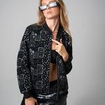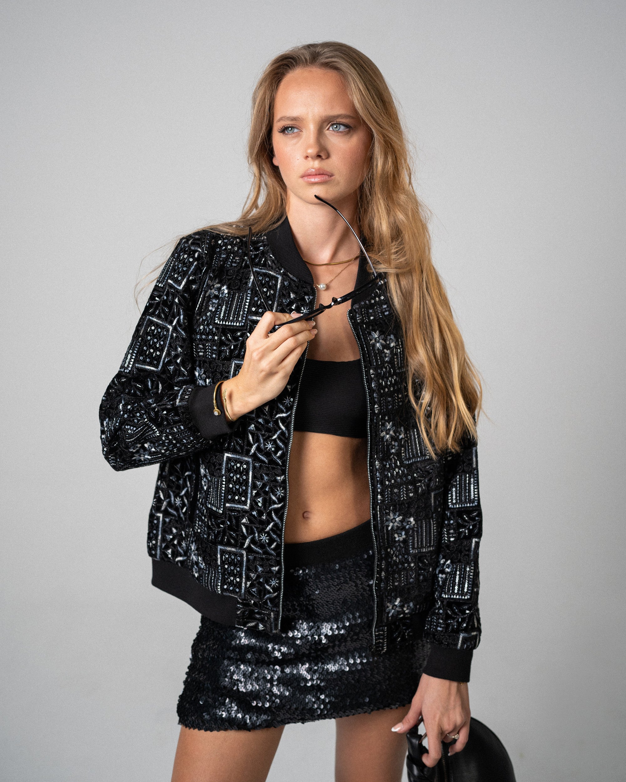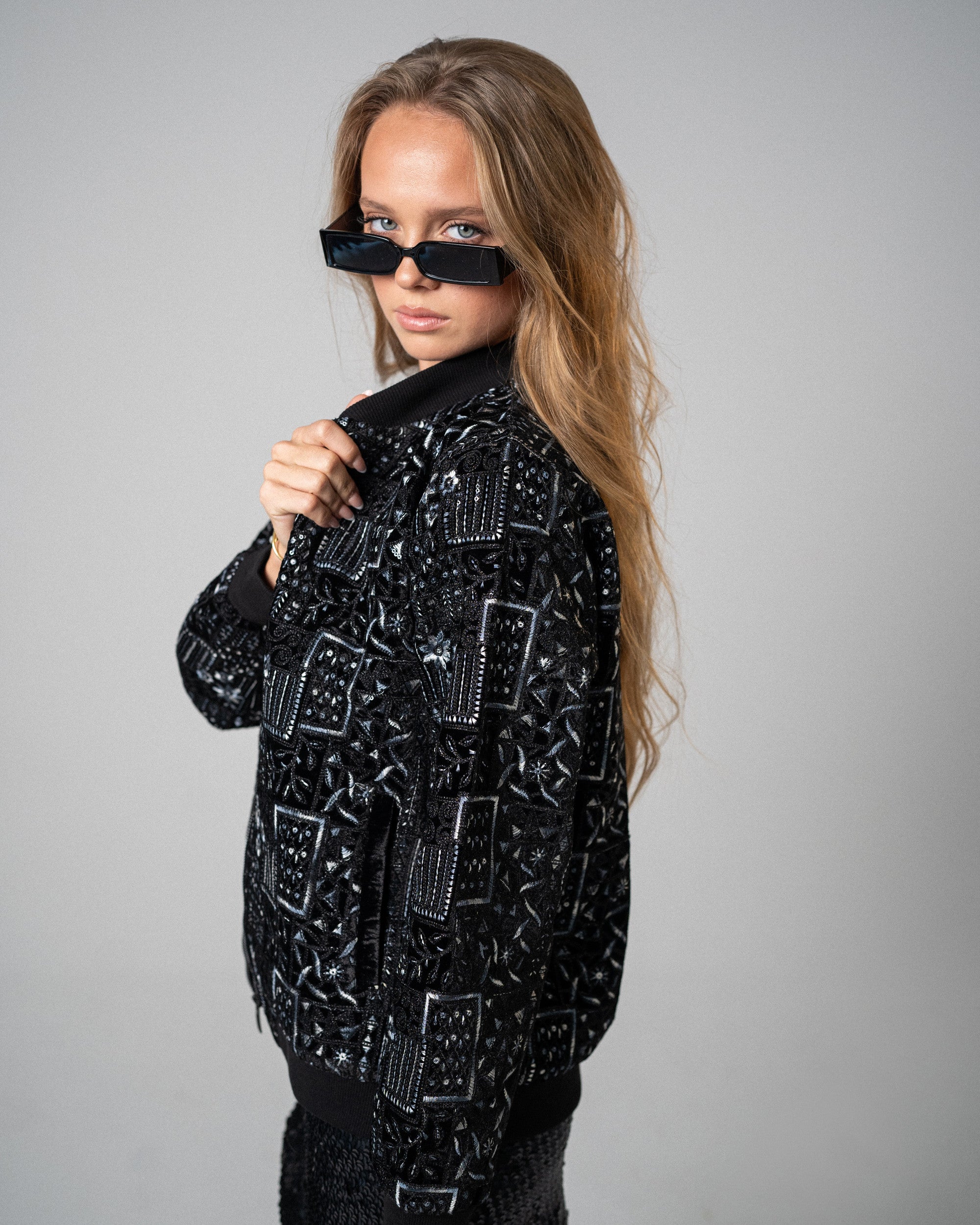 Elevate your evening wardrobe with our Women’s Premium Velvet Bomber Jacket with Embroidery, an exquisite fusion of opulent fabric and intricate detailing. The soft sheen of the velvet adds a sophisticated flair, while the bold, artistic embroidery provides a striking contrast, creating a modern yet timeless look. Designed specifically for those seeking a stylish alternative to traditional partywear, the jacket combines the classic bomber silhouette with elevated elements. The **embroidered accents**, carefully placed on both the front and back, add an elegant, detailed touch that speaks to both artistry and craftsmanship.