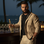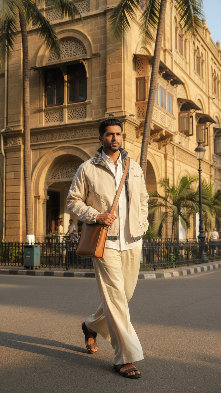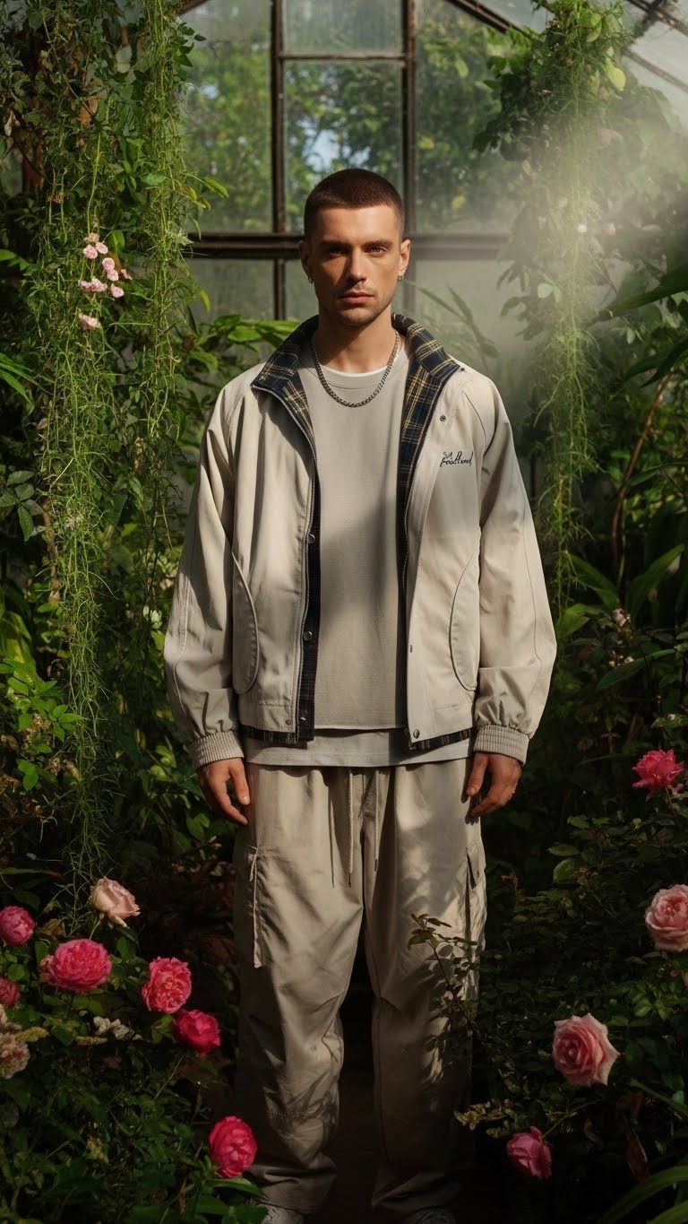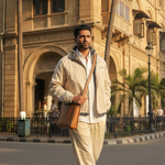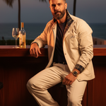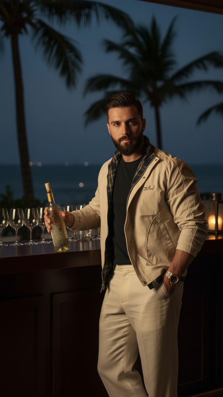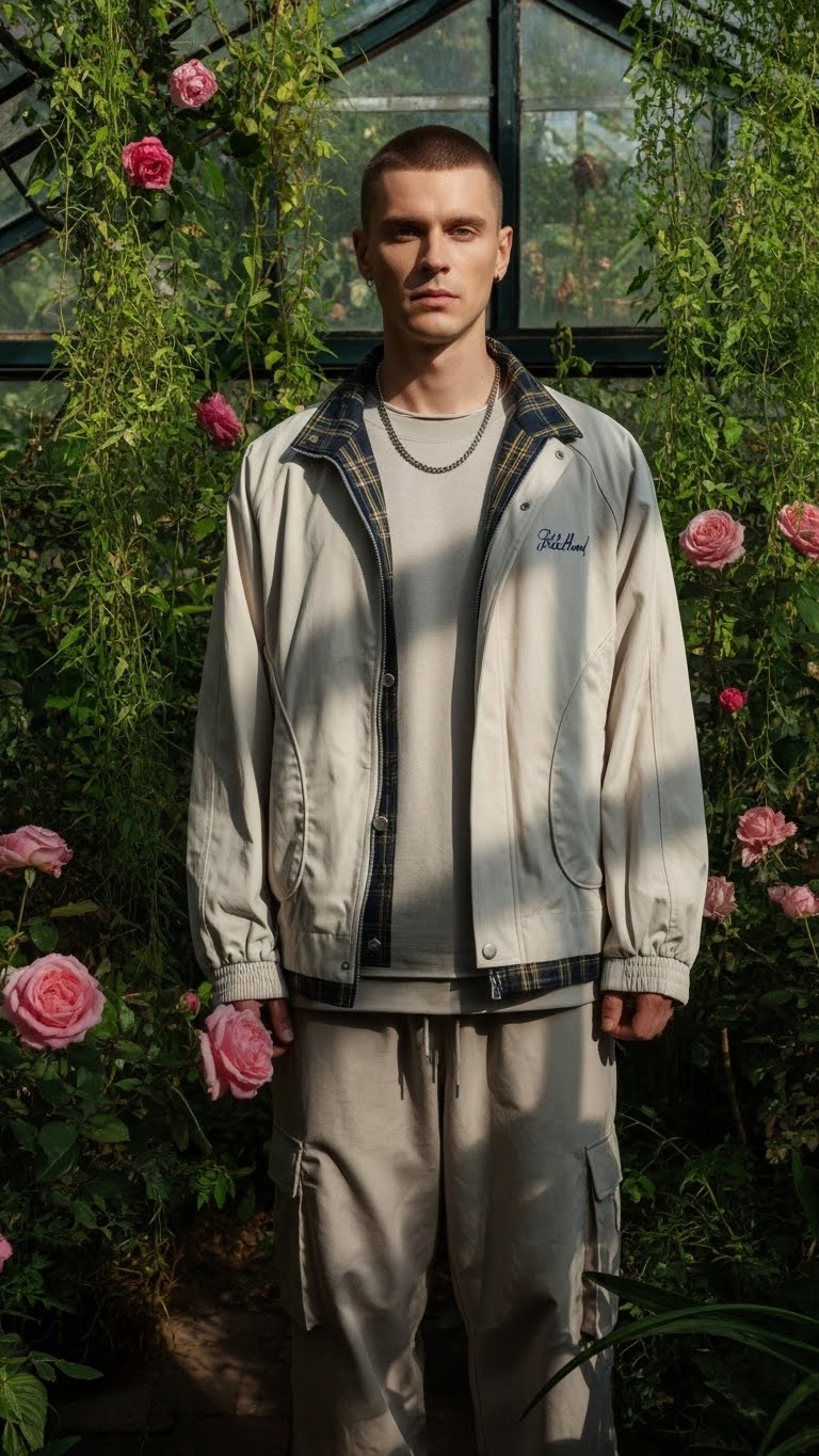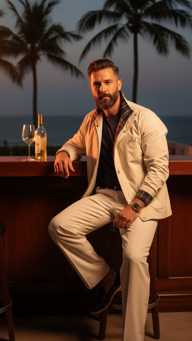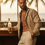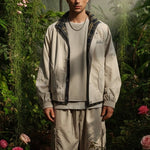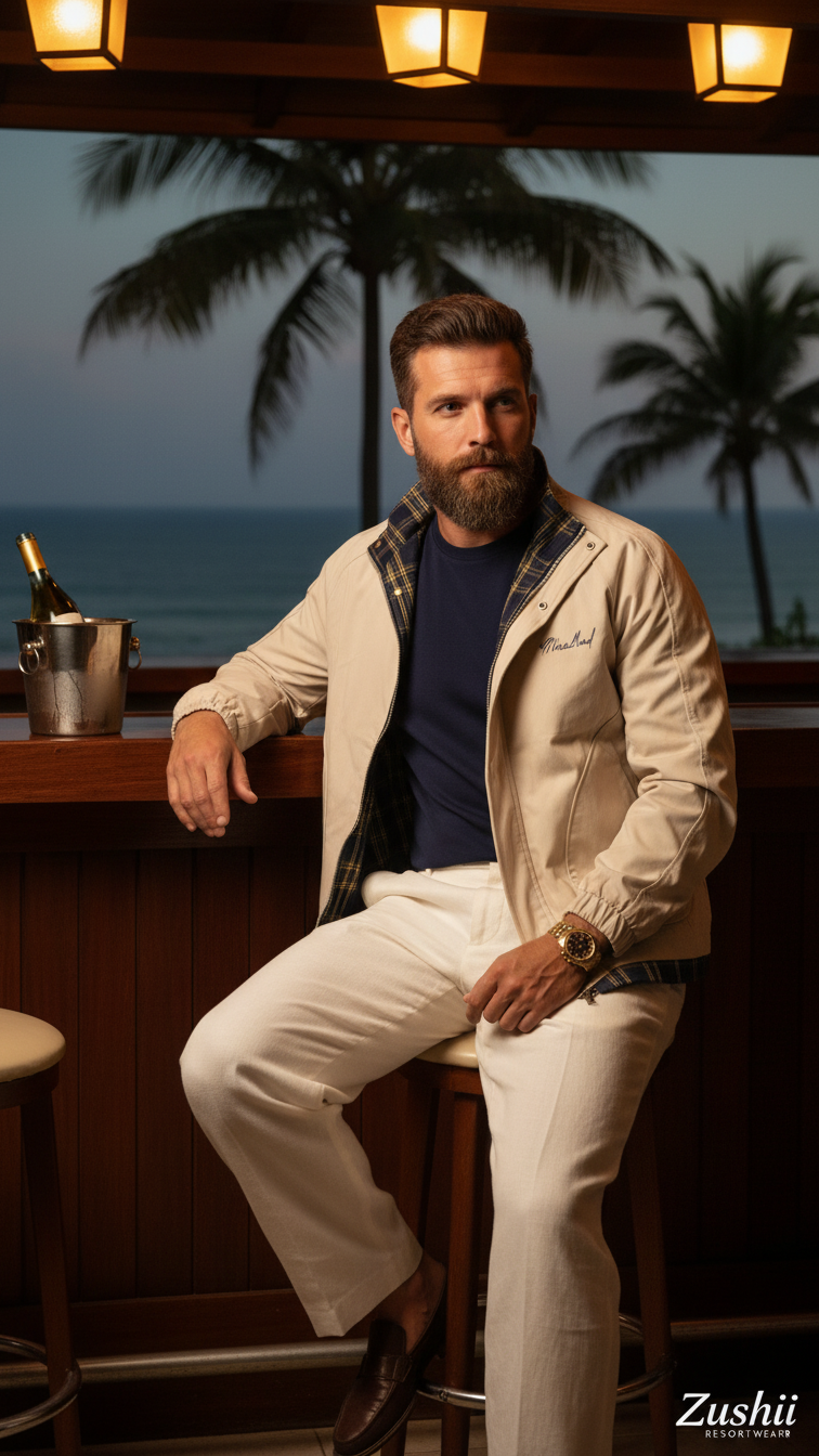 Lightweight canvas in pale cream with check on the inside collar, zip-front closure, and tassel fringe for breathable warm-weather layering over tees or bare skin. Relaxed oversized fit with ribbed cuffs pairs seamlessly with linen whites for high-end vacation styling.