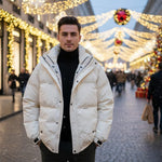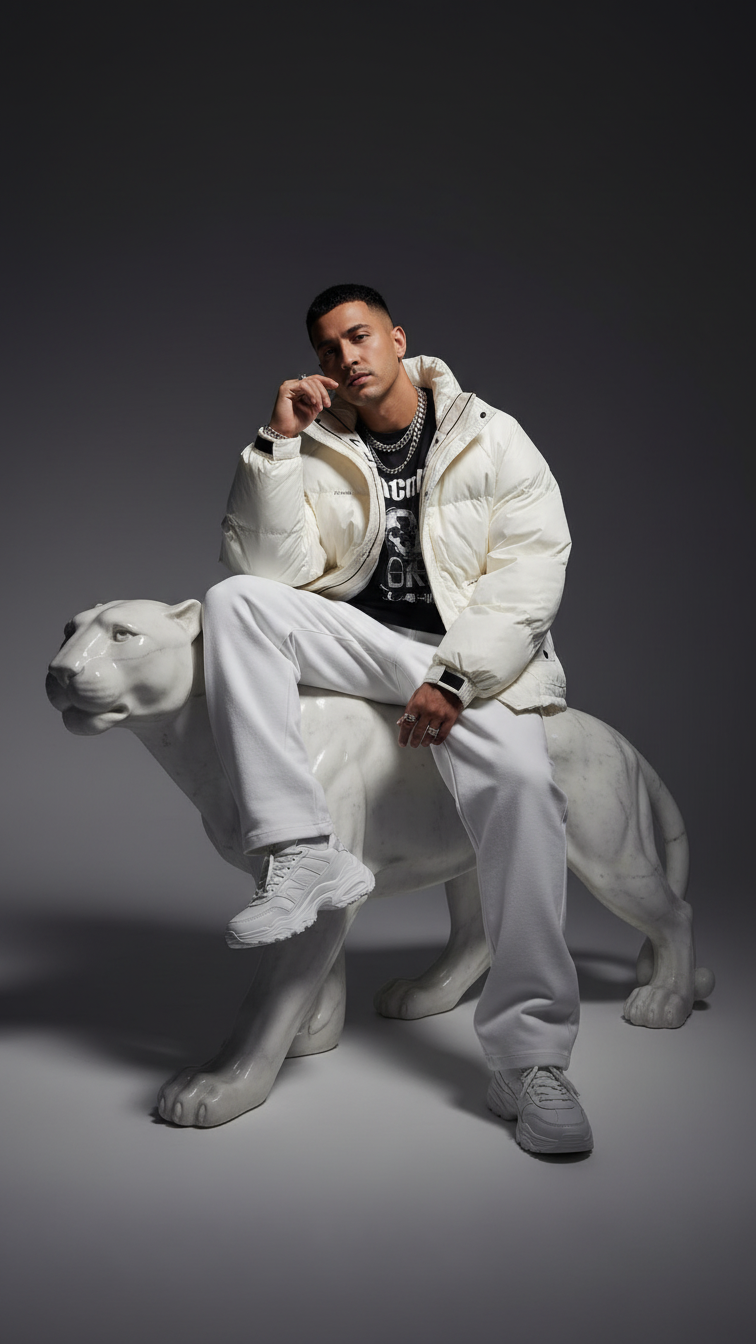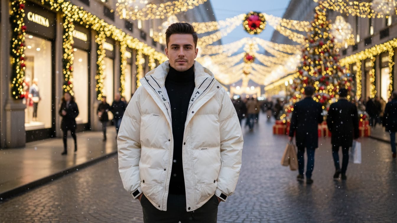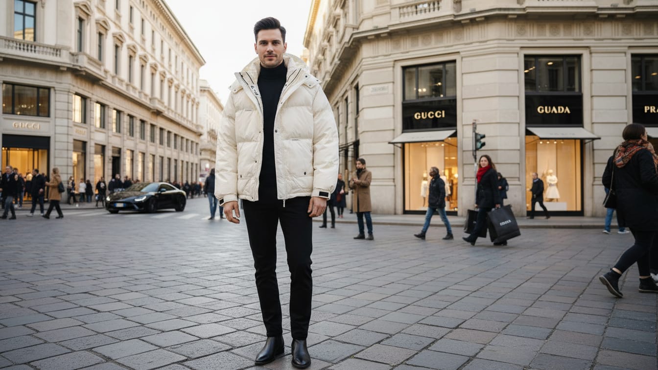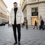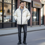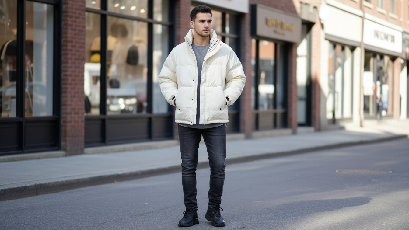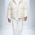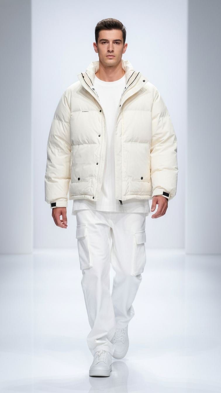 A clean, winter‑white puffer jacket with a stand collar, quilted padding, and front zip closure, designed to layer effortlessly over dark basics for a sleek, city-ready cold‑weather look.