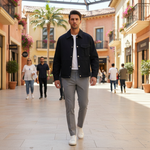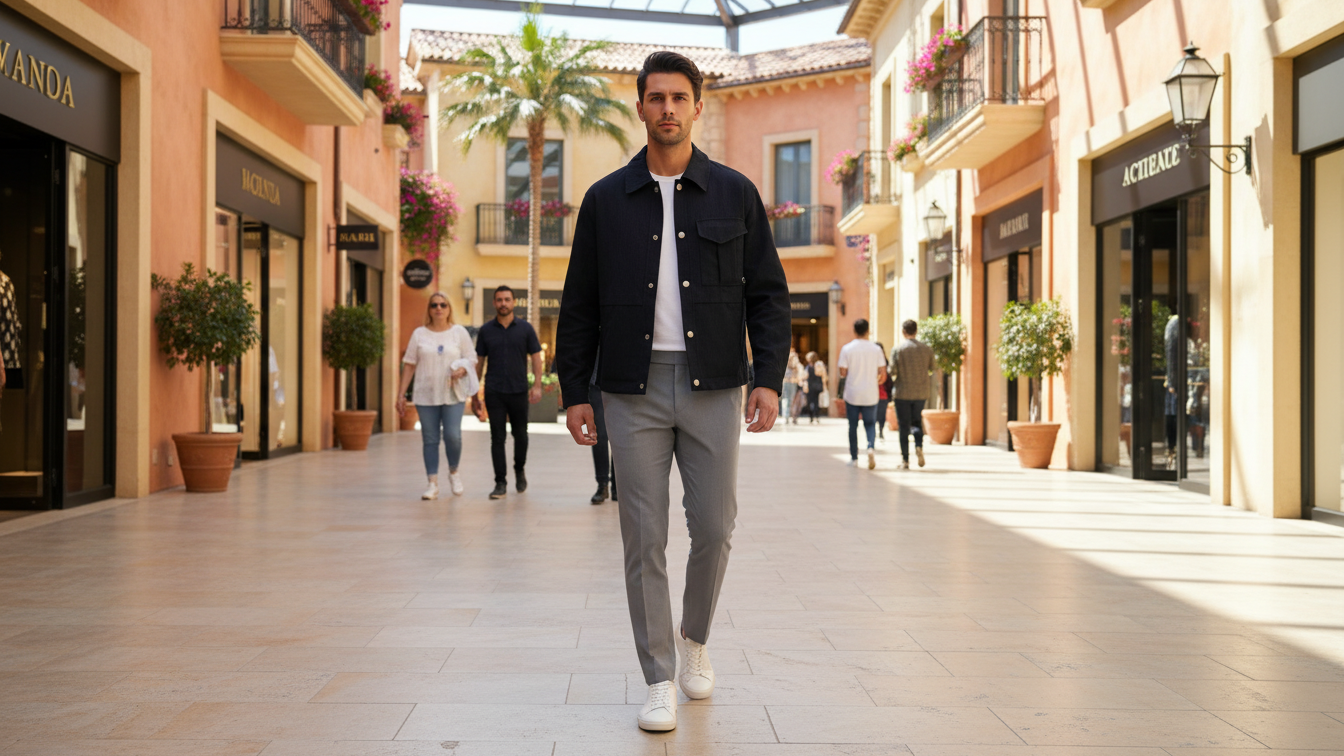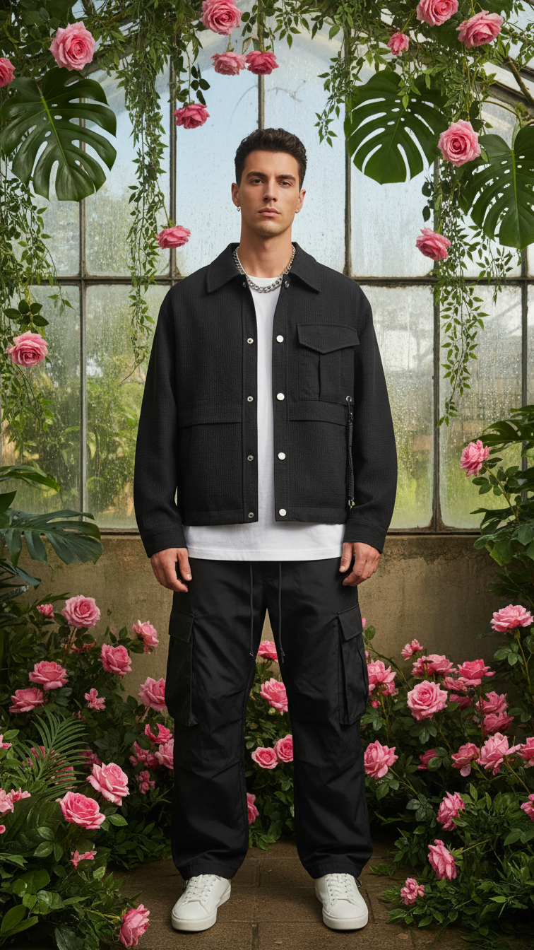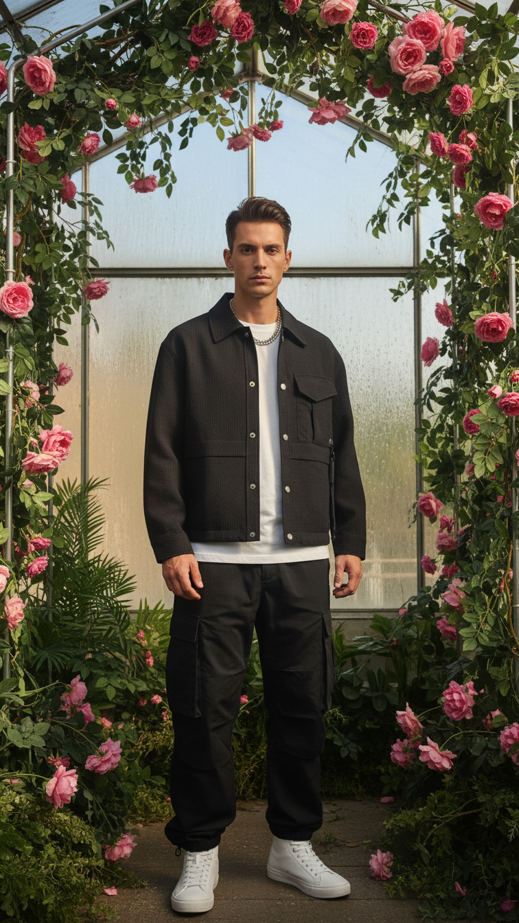 Crafted for Zushii's modern menswear, it evokes effortless sophistication—perfect for transitional seasons and Instagram-ready shoots. The greenhouse setting amplifies its verdant, high-end appeal